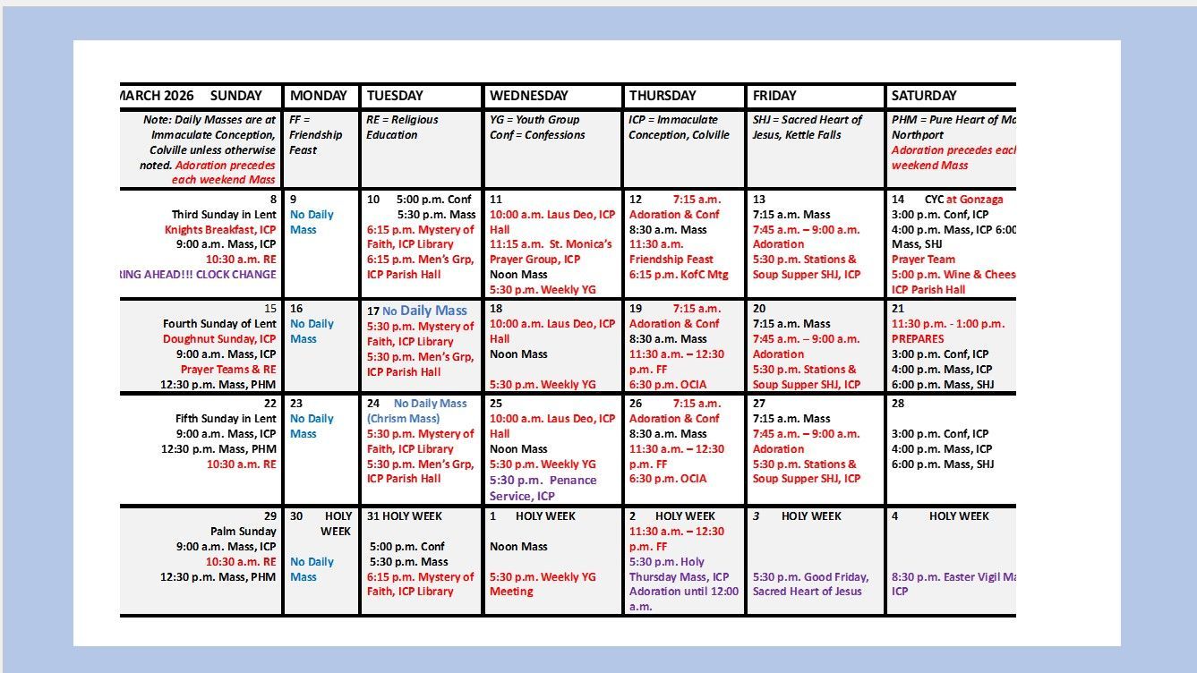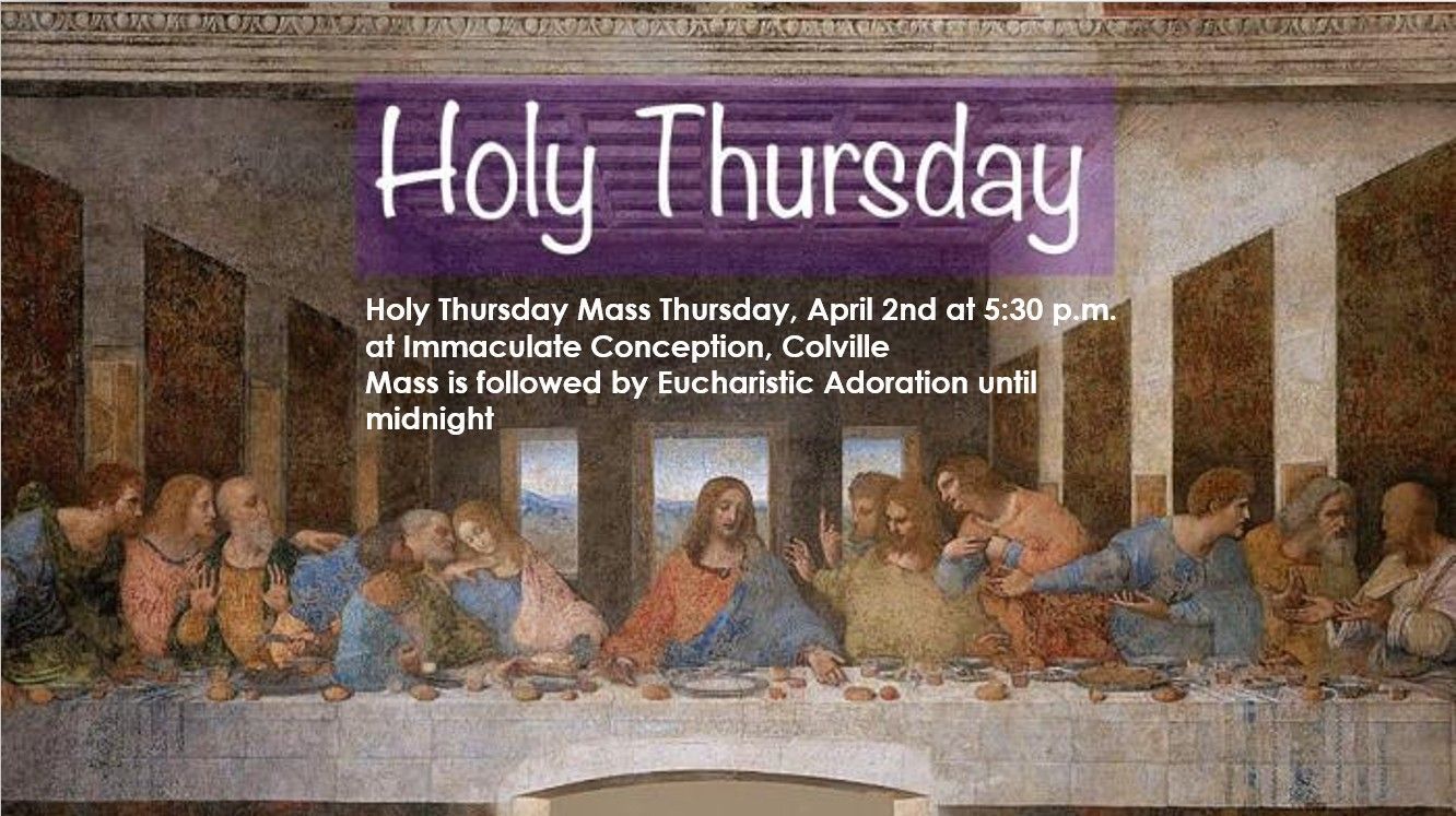Sundays in Northport: .................... 30 minutes before Mass Thursdays in Colville:........................7:15 a.m. - 8:15.a.m.